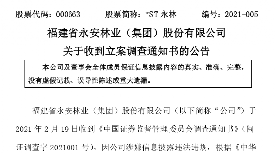 2月22日晚间,*ST永林公告称,公司受到中国证监会《调查通知书》:“因公司涉嫌信息披露违法违规,根据《中华人民共和国证券法》的有关规定,中国证券监督管理委员会决定对公司立案调查,请予以配合。”