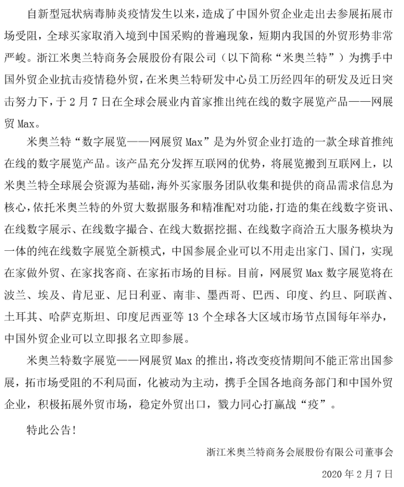 1. 公告称,“网展贸 S”是依托互联网和云计算技术,集合数字建站、数字画像、数字营销、数字商洽、数字资讯等服务功能的新型数字化展览产品,旨在打造大数据背景下个性化、定制化、私域流量下的企业“专属展会” 。
