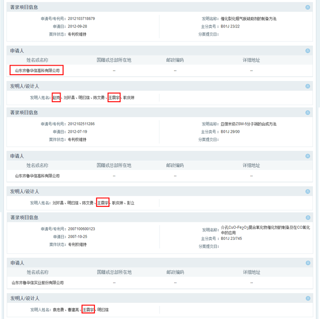 据国家知识产权局披露,齐鲁华信子公司华信高科持有一项名为“催化裂化烟气脱硫助剂的制备方法”的发明专利,申请日为2012年9月28日,赵克、王震宇均被列为发明人,而该专利的其他发明人包括齐鲁华信核心技术人员刘环昌和公司实控人明曰信、陈文勇。同时,王震宇还参与了齐鲁华信、华信高科的另外两项发明专利,分别是“亚微米级ZSM-5分子筛的合成方法”、“介孔CuO-Fe2O3复合氧化物催化剂的制备及在CO氧化中的应用”,申请日分别为2012年7月19日、2007年10月25日。