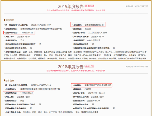 同时,淄博蓝泰经贸有限公司(以下简称“蓝泰经贸”)、淄博市周村正飞不锈钢有限公司(以下简称“正飞不锈钢”)为同一控制下企业,报告期内始终为齐鲁华信的第一大供应商。2017年至2020年上半年,齐鲁华信对蓝泰经贸、正飞不锈钢的采购金额合计分别为3652.79万元、3566.69万元、4382.50万元、2124.78万元,占比分别为16.60%、11.06%、9.86%、11.14%。巧合的是,蓝泰经贸、正飞不锈钢的联系电话亦为“13345**5822”,与荣一恒完全一致。
