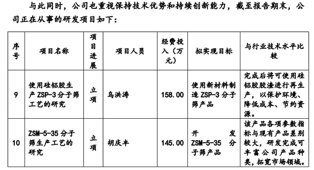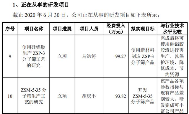 据披露,截至2020年6月30日,在齐鲁华信正在从事的研发项目中,“使用硅铝胶生产ZSP-3分子筛工艺的研究”项目拟使用新材料制造ZSP-3分子筛产品,经费投入为99.27万元,而“ZSM-5-35分子筛生产工艺的研究”项目拟开发ZSM-5-35分子筛产品,经费投入为93.82万元。