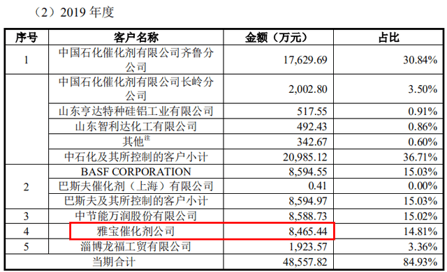 2019年,齐鲁华信向雅宝催化剂公司(Albemarle Corporation,以下简称“雅宝催化剂”)销售了ZSM-5系列分子筛、Y 型系列分子筛等石油化工催化新材料,金额合计7853.59万元。同时,公司还向雅宝催化剂销售环保催化新材料烟气脱硫助,销售金额为631.16万元。因此,2019年,齐鲁华信对雅宝催化剂的销售金额合计至少应为8484.75万元。然而,公开发行说明书称,齐鲁华信对雅宝催化剂的2019年销售金额为8465.44万元,竟不及上述两类产品的销售额之和。
