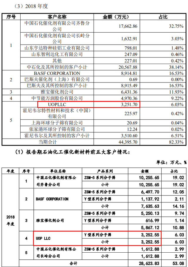 无独有偶,霍尼韦尔是齐鲁华信的2018年第五大客户,齐鲁华信对其子公司UOP LLC的销售收入为3251.70万元。但同时,齐鲁华信在2018年对UOP LLC销售石油化工催化新材料的金额已达到3252.55万元,较其披露的对UOP LLC的整体销售收入高出0.85万元。