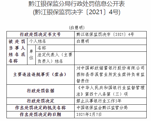中国银保监会黔江监管分局于2021年2月7日作出上述处罚决定,处罚依据为行政处罚依据 《中华人民共和国银行业监督管理法》第四十八条第(三)项。