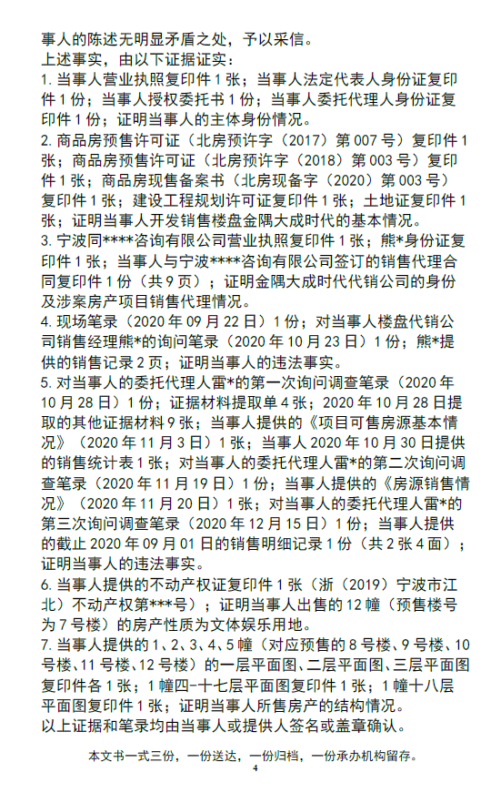 2021年1月11日, 宁波市江北区市场监督管理局向金隅大成地产送达了甬北市监听告[2021]4号《行政处罚听证告知书》。金隅大成地产于法定期限内未要求举行听证,也未提出相关陈述和申辩。