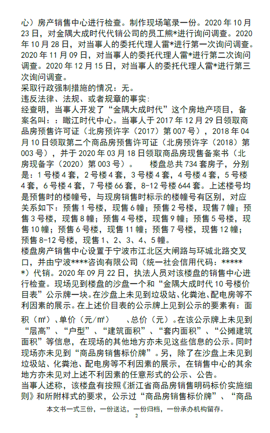 行政处罚决定书显示这起案件来源为监督检查:“2020年9月22日,执法人员对当事人金隅大成地产开发的,位于宁波市江北区大闸路与环城北路交叉口的金隅大成时代(瞰江时代中心)房产销售中心进行检查。现场见到楼盘的沙盘一个和“金隅大成时代10号楼价目表”公示牌一块。在沙盘上未见到垃圾站、化粪池、配电房等不利因素的展示。在上述价目表的公示牌上见到公示的要素有:面积(平方米)、单价(元/平方米)、总价(元)。在该公示牌上未见到“层高”、“户型”、“建筑面积”、“套内面积”、“公摊建筑面积”等信息,在现场的其他地方亦未见这些信息的公示。同时现场亦未见到“商品房销售标价牌”。另,除了在沙盘上未见到垃圾站、化粪池、配电房等不利因素的展示,在销售中心的其余地方亦未见对上述不利因素的任意形式的公示、公告。当事人的行为涉嫌违反《中华人民共和国价格法》的有关规定,经局负责人批准后予以立案调查。”
