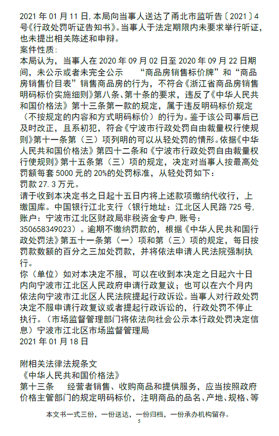 宁波金隅大成时代项目违法遭处罚 售楼未能明码标价