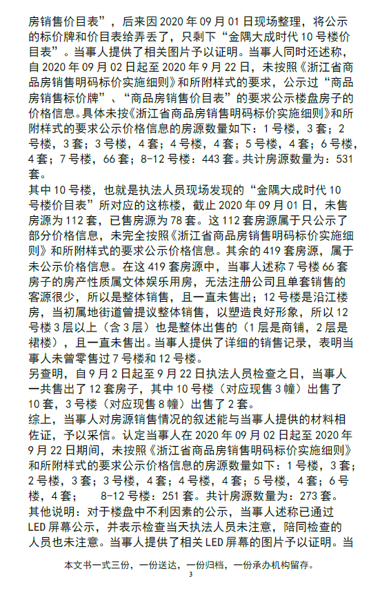 其中10号楼,也就是执法人员现场发现的“金隅大成时代10号楼价目表”所对应的这栋楼,截止2020年9月01日,未售房源为112套,已售房源为78套。这112套房源属于只公示了部分价格信息,未完全按照《浙江省商品房销售明码标价实施细则》和所附样式的要求公示价格信息。其余的419套房源,属于未公示价格信息。在这419套房源中,当事人述称7号楼66套房子的房产性质属文体娱乐用房,无法注册公司且单套销售的客源很少,所以是整体销售,且一直未售出;12号楼是沿江楼房,当初属地街道曾提议整体销售,以塑造良好形象,所以12号楼3层以上(含3层)也是整体出售的(1层是商铺,2层是裙楼),且一直未售出。当事人提供了详细的销售记录,表明当事人未曾零售过7号楼和12号楼。
