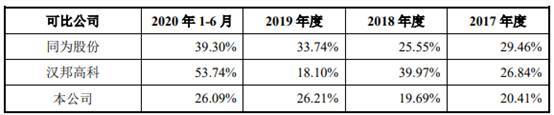 2016年至2020年上半年,可比公司中同为股份的毛利率分别为34.66%、29.46%、25.55%、33.74%和39.30%,汉邦高科的毛利率分别为32.63%、26.84%、39.97%、18.10%和53.74%。