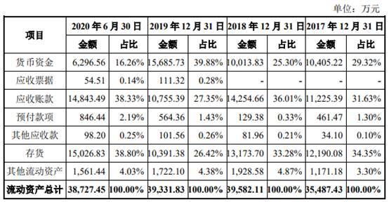 公司的流动资产主要由货币资金、应收账款、存货构成。2016年至2020年上半年各期末,安联锐视的货币资金分别为9173.77万元、10,405.22万元、10,013.83万元、15,685.73万元和6296.56万元,主要由银行存款构成。