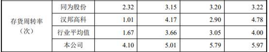 上述各期末,安联锐视的存货周转率分别为4.47、5.97、5.79、5.01和4.10,同行业可比公司同为股份的存货周转率分别为3.80、3.22、3.20、3.15和2.32,汉邦高科存货周转率分别为3.75、4.78、2.90、4.17和1.01。