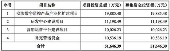 此次安联锐视拟募集资金51,646.39万元,其中19,885.48万元用于安防数字监控产品产业化扩建项目,11,198.49万元用于研发中心建设项目,10,026.23万元用于营销运营平台建设项目,10,536.19万元用于补充营运资金。