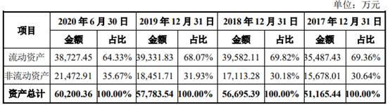 招股书披露,2016年至2020年上半年各期末,安联锐视的资产总计46,344.65万元、51,165.44万元、56,695.39万元、57,783.54万元和60,200.36万元,流动资产分别为31,795.11万元、35,487.43万元、39,582.11万元、39,331.83万元和38,727.45万元,占比分别为68.61%、69.36%、69.82%、68.07%和64.33%。