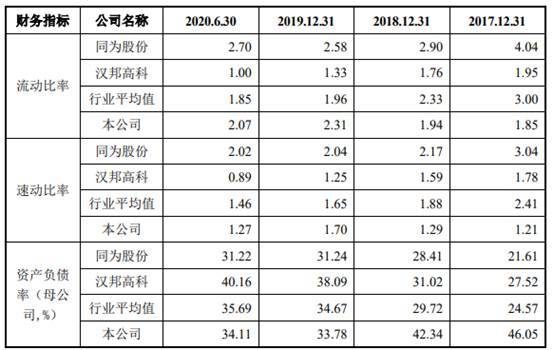 另一家可比公司汉邦高科的资产负债率分别为25.06%、27.52%、31.02%、38.09%和40.16%,流动比率分别为3.09、1.95、1.76、1.33和1.00,速动比率分别为2.67、1.78、1.59、1.25和0.89。