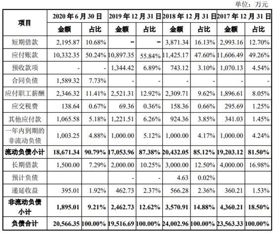 2016年至2020年上半年各期末,安联锐视的负债合计25,179.68万元、23,563.33万元、24,002.96万元、19,516.69万元和20,566.35万元,流动负债分别为19,931.93万元、19,203.12万元、20,432.05万元、17,053.96万元和18,671.34万元,占比79.16%、81.50%、85.12%、87.38%和90.79%。