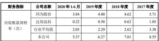 2016年至2020年上半年各期末,安联锐视的应收账款周转率分别为5.94、8.55、7.01、6.27和5.37,同行业可比公司同为股份的应收账款周转率分别为7.48、5.71、4.62、4.00和3.84,汉邦高科的应收账款周转率分别为1.31、1.05、0.62、0.58和0.22。
