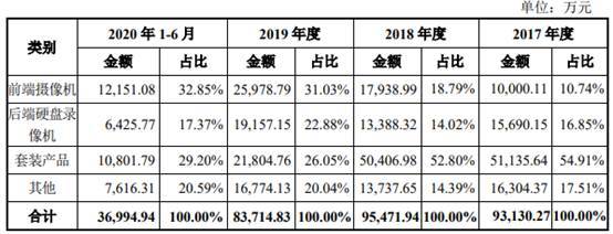 2016年至2020年上半年,安联锐视各产品类别收入波动较大。其中前端摄像机的销售金额分别为7739.78万元、10,000.11万元、17,938.99万元、25,978.79万元和12,151.08万元,占主营业务收入比例分别为14.23%、10.74%、18.79%、31.03%和32.85%,上升极快。