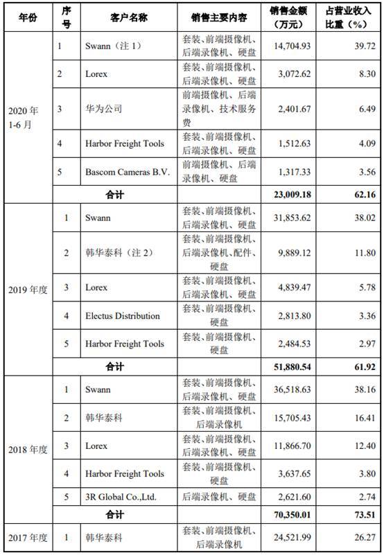 公司第二大客户韩华泰科,2017年至2020年上半年,安联锐视向其销售金额分别为24,521.99万元、15,705.43万元、9889.12万元和1007.94万元。安联锐视称,由于韩华泰科的越南工厂未达预期以及未与美国市场主要渠道商Sam’sClub达成2020年度合作协议,2020年上半年安联锐视向对韩华泰科的销售发生了重大不利变化。