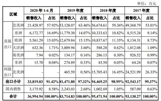 公司主要出口地以北美、欧洲、亚洲市场为主,其中公司对北美市场的销售收入分别为30,891.31万元、49,368.79万元、56,674.61万元、53,128.07万元和21,428.97万元,占营收比重分别为56.81%、53.01%、59.36%、63.46%和57.92%。