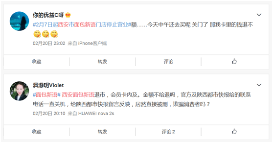 在微博平台上,有西安网友称其2月20日中午曾去面包新语门店购物,结果发现关门,“那我卡里的钱退不退?”还有网友称,西安面包新语给出的联系电话一直关机,无法办理退费。
