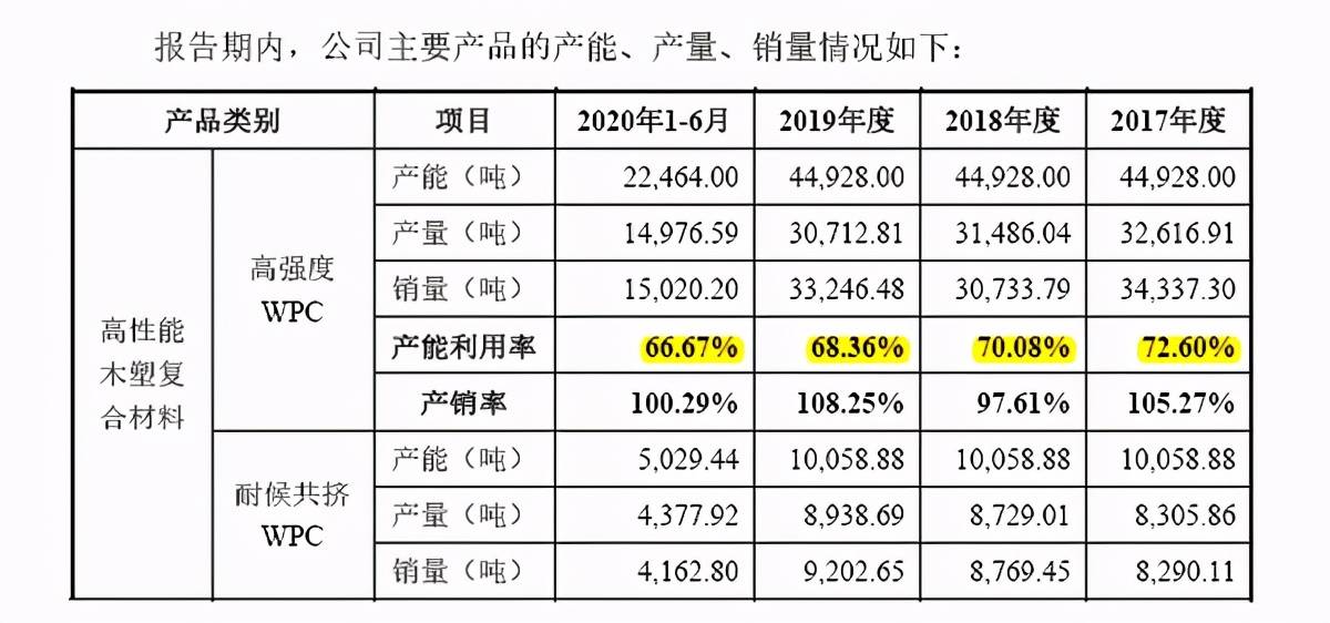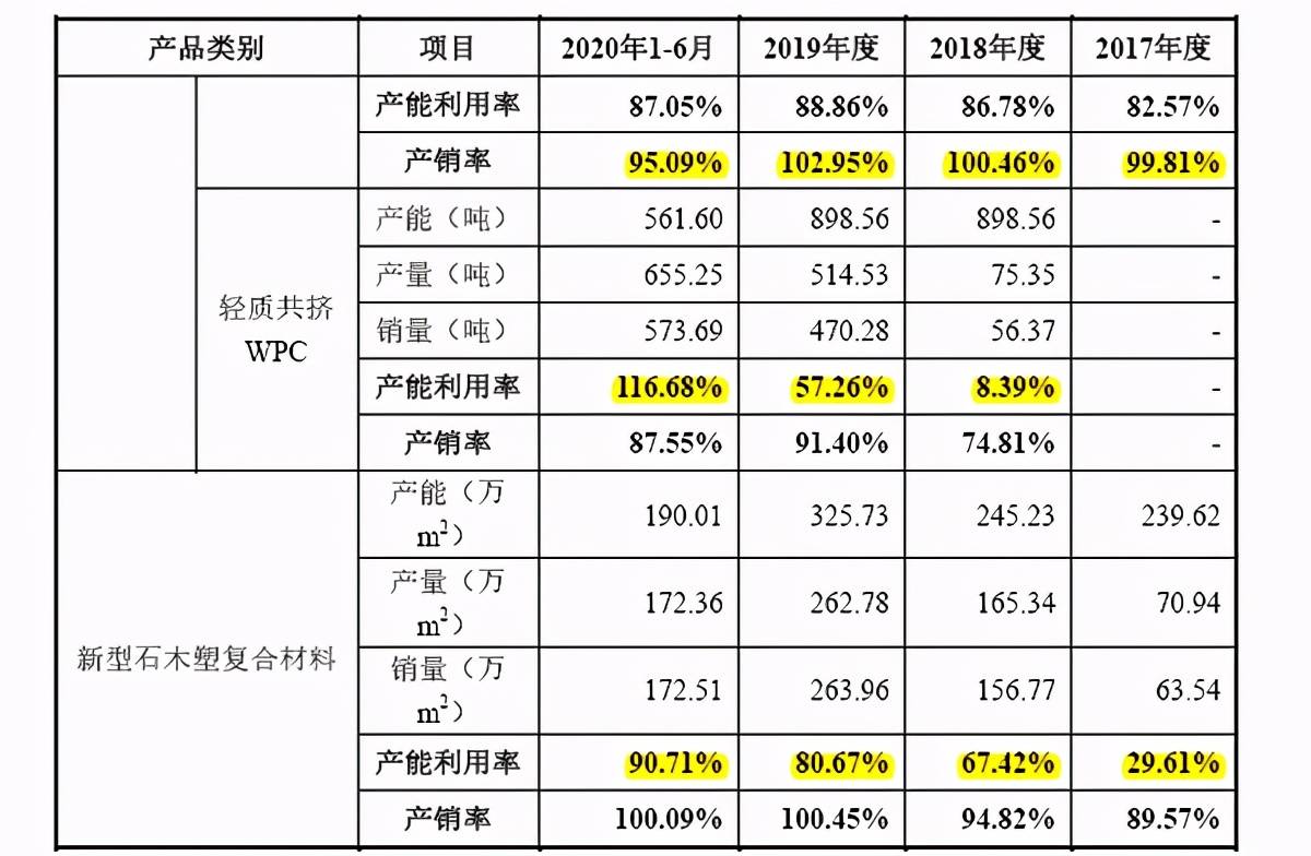 从产能利用率上看,森泰股份轻质共挤木塑复合材料现有产能仅561.60吨,而募投项目上来就是年产2万吨,不知未来消化能力能否达到,而新型石木塑复合材料现有的产能也仅190万平方米,而销量也不过是172.51万平方米,一下子翻倍近4倍,产销能否消化也存疑。