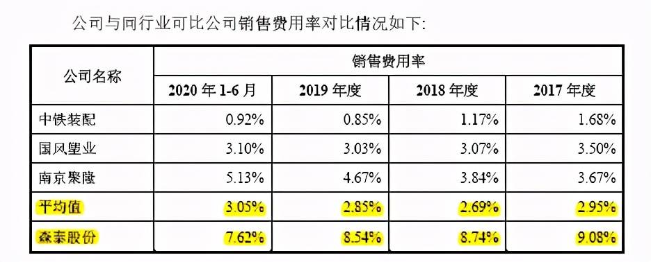 高毛利率的另一面,则是森泰股份销售费用率高于同行业可比公司,其称主要原因系公司外销收入占比较高,工厂至港口运输费用较大所致;另外公司业务处于快速发展期,为积极拓展市场份额,公司加大市场开拓投入力度所致。