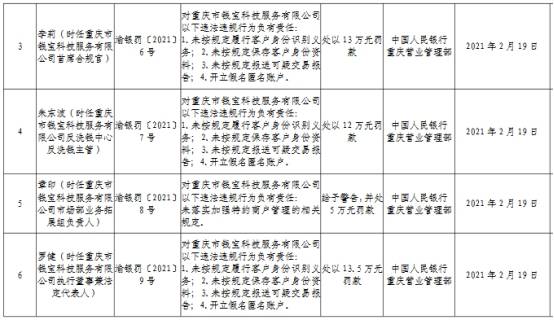 渝银罚〔2021〕6号显示,李莉时任钱宝科技首席合规官,对钱宝科技4宗违法违规行为负有责任:1.未按规定履行客户身份识别义务;2.未按规定保存客户身份资料;3.未按规定报送可疑交易报告;4.开立假名匿名账户。中国人民银行重庆营业管理部对其处以13万元罚款。