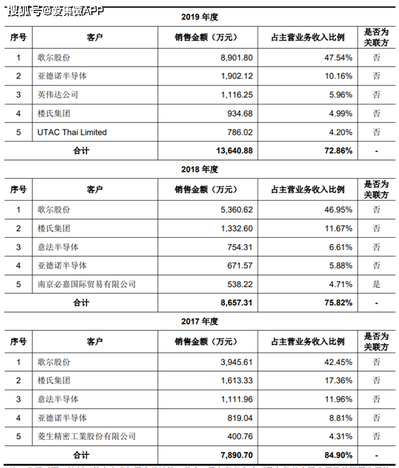 2019年,和林科技的前五大客户为歌尔股份、亚德诺半导体、英伟达半导体、楼氏集团、UTACThaiLimited。2017年、2018年、2019年,和林科技来自公司前五名客户的销售收入占公司主营业务收入的比例分别为84.90%、75.82%以及72.86%。