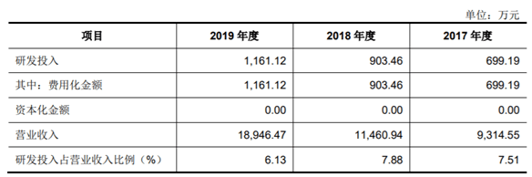 2017年至2019年,和林科技的研发投入分别为699.19万元、903.46万元和1,161.12万元,占营业收入的比例分别为7.51%、7.88%和6.13%。报告期内,公司研发费用合计2,763.77万元,占公司报告期营业收入的总额为6.96%。