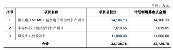 本次IPO上市,和林科技拟募集资金3.27亿元,投资微机电(MEMS)精密电子零部件扩产项目、半导体芯片测试探针扩产项目和研发中心建设项目。