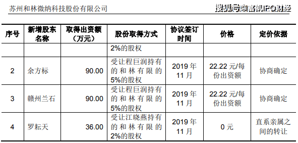 另据招股书披露,和林科技在2019年11月发生了股权变动,引入了部分新增股东,其中其中苏州和阳为发行人的员工持股平台,余方标和赣州兰石为财务投资者。