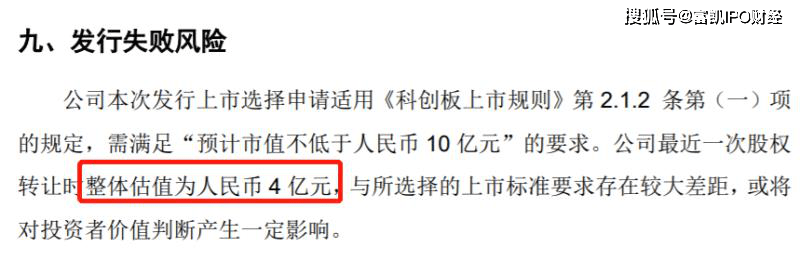 此外,和林科技还在招股书中提示到了“发行失败风险”,披露到:公司本次发行上市选择申请适用《科创板上市规则》第 2.1.2 条第(一)项 的规定,需满足“预计市值不低于人民币10亿元”的要求。公司最近一次股权转让时整体估值为人民币4亿元,与所选择的上市标准要求存在较大差距,或将 对投资者价值判断产生一定影响。