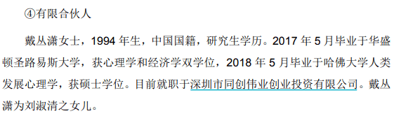 但事实上,赣州兰石持股约60%的主要有限合伙人为戴丛潇女士,招股书披露,戴丛潇女士1994 年生,中国国籍、研究生学历,2018年 5月才从哈佛大学人类发展心理学硕士学位毕业,目前就职于深圳市同创伟业创业投资有限公司。戴丛潇为刘淑清之女儿。