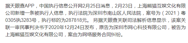 2月25日,根据某企业查询APP显示,中国执行信息公开网2月25日消息,在2月23日王思聪的上海熊猫互娱文化有限公司新增一条被执行人信息,执行标的287818元。