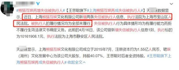 王思聪关联公司又引争端 上海熊猫互娱再成被执行人
