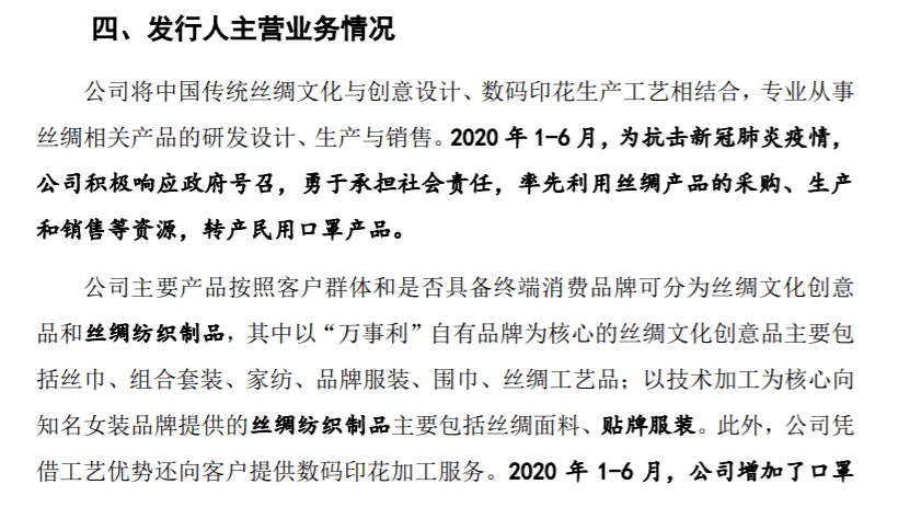 据了解,万事利成立于2007年,其主要产品按照客户群体和是否具备终端消费品牌可分为丝绸文化创意品和丝绸纺织制品。