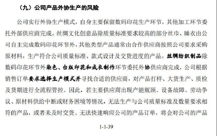 生产模式方面,招股书显示,万事利生产模式主要分为自主加工和外协生产。其中,外协模式即为公司自身主要保留数码印花生产环节,其他加工环节委托外部供应商完成。