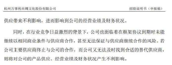 “同时,在行业竞争日益激烈的背景下,公司也面临着在框架协议到期时未能继续以相同商业条件与供应商合作,甚至无法保证与供应商继续合作的风险。若公司主要供应商终止与公司的合作,而公司又无法及时找到合适的替代供应商,则将对公司的产品供应、经营业绩及财务状况产生不利影响。”万事利在招股书中表示。