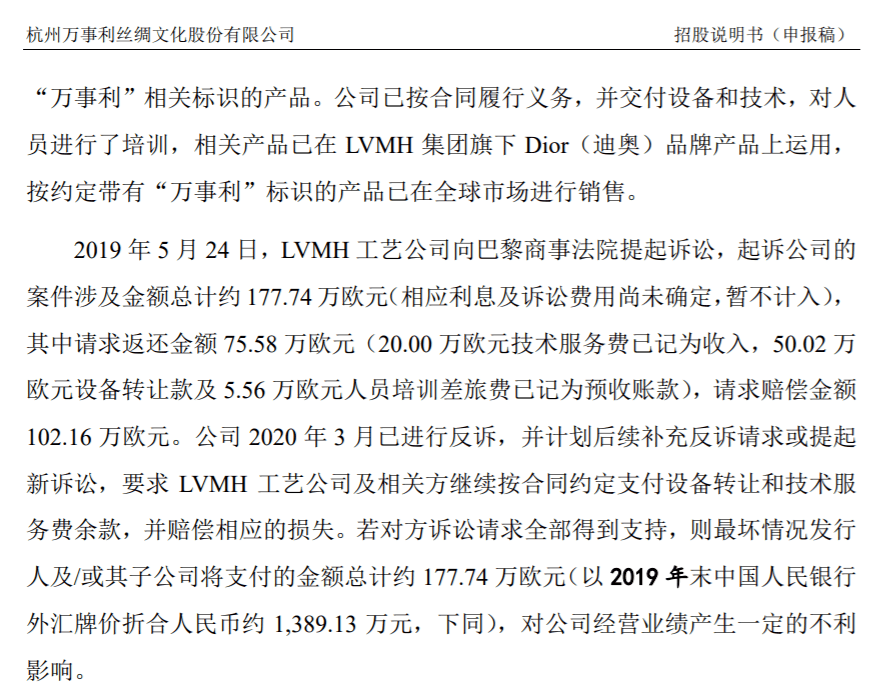 然而,之后双方合作出现争议,这家高格调的合作方最终变成了起诉方。2019年5月24日,LVMH工艺公司及其子公司在巴黎商事法院对万事利及相关方提起诉讼,提出要求解除合作关系,并要求公司返还及赔偿款项合计177.74万欧元。(相应利息及诉讼费用尚未确定,暂不计入)。