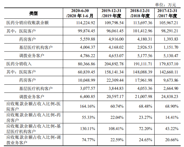 其中,医院客户应收账款余额占收入比例从2017年的68.90%增长至2020年上半年的164.16%,3年半增长了95.26个百分点;基层医疗机构客户应收账款余额占收入比例从2017年的43.22%增长至2020年上半年的130.11%,3年半增长了86.89个百分点。