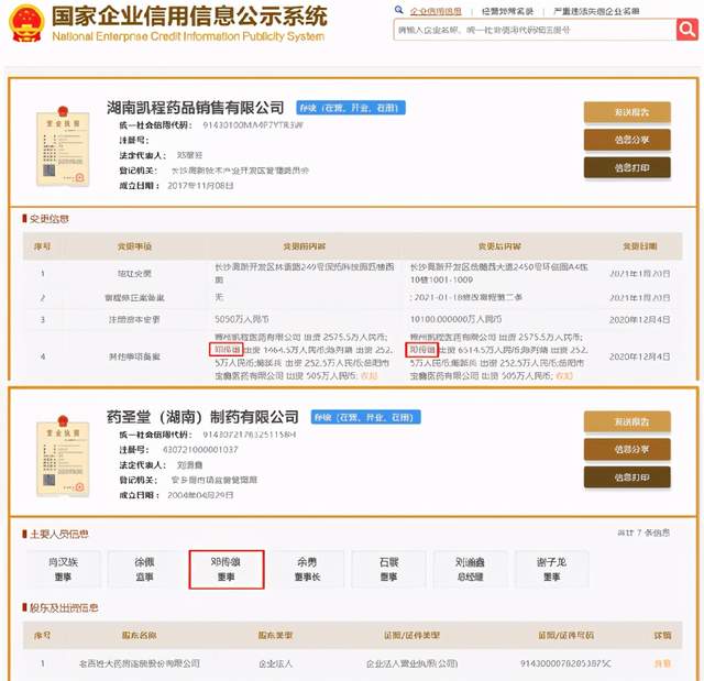 值得注意的是,邓传雄通过郴州凯程医药有限公司实际控制湖南凯程。据工商信息显示,邓传雄兼任药圣堂(湖南)制药有限公司(以下简称“药圣堂”)董事,而药圣堂正是达嘉维康股东老百姓大药房连锁股份有限公司(证券简称:老百姓,证券代码:603883.SH)的全资子公司。
