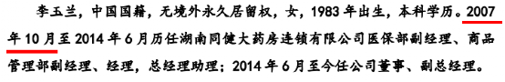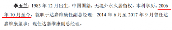 据招股书披露,李玉兰自2006年10月至今就职于达嘉维康,现任公司副总经理。但据公司于2015年2月披露的新三板公开转让说明书显示,李玉兰的入职时间为2007年10月。