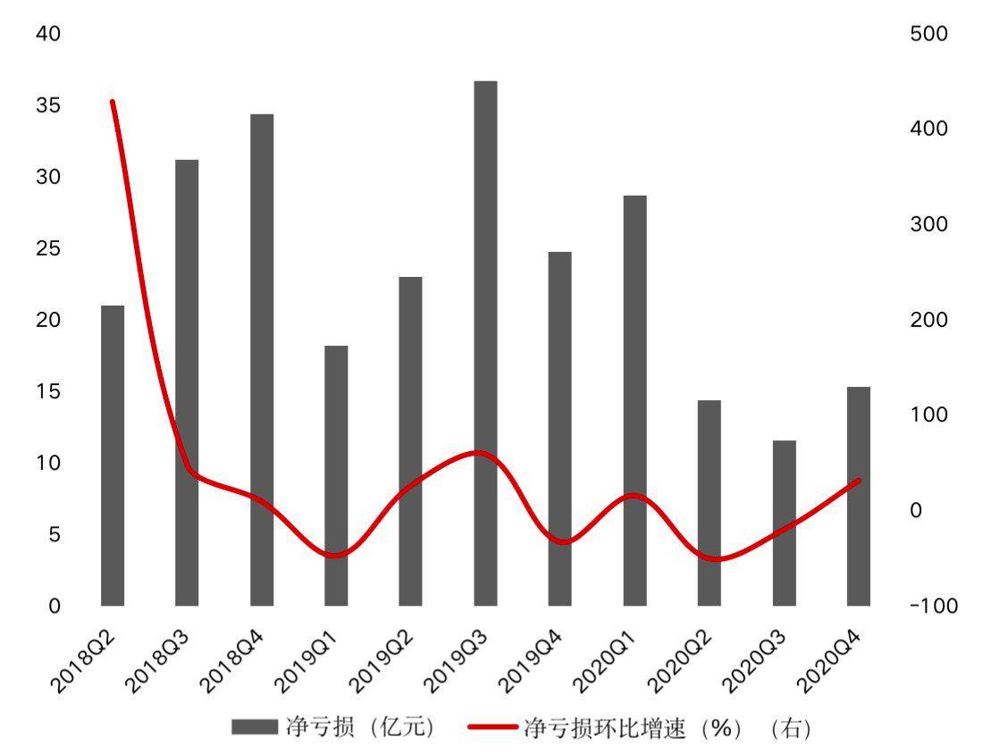 与此同时,《投资时报》研究员留意到,一方面,自2018年3月上市至2020年末,该公司各季度单季业绩全部为净亏损,且净亏损额曾于2019年第三季度上冲至最大值37亿元,即便是2020年第三季度最小的净亏损额也超过10亿元。另一方面,若从环比增速来看,其净亏损环比增速已由2018年第二季度的492.22%大幅下降至2020年第四季度的31.96%,但这并未改变其净亏损延续的态势。