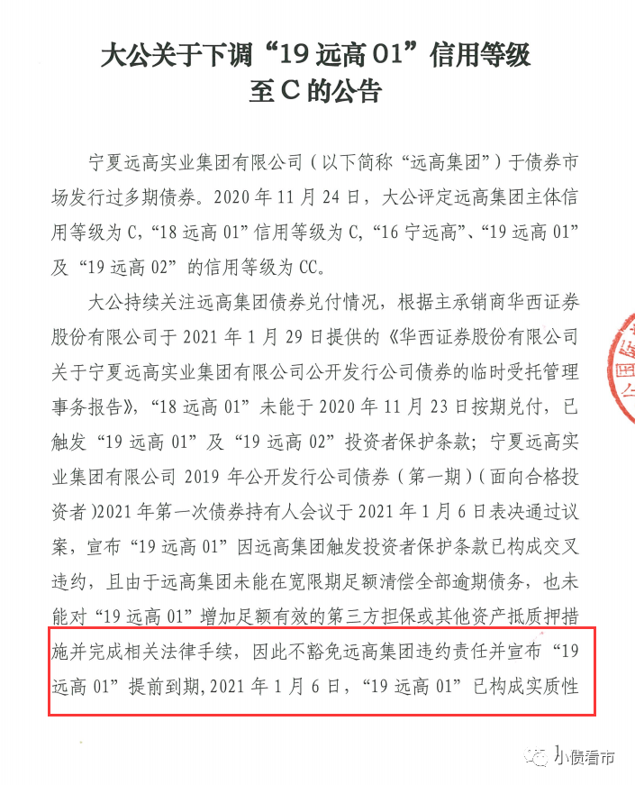由于远高集团未能在宽限期足额清偿全部逾期债务,也未能对“19远高01”增加足额有效的第三方担保或其他资产抵质押措施,因此该债提前到期,2021年1月6日“19远高01”已构成实质性违约。