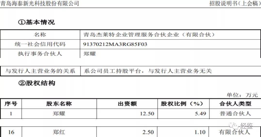 据招股说明书披露,青岛杰莱特企业管理服务合伙企业(以下简称“杰莱特”)为海泰新光员工持股平台,其中郑红为杰莱特的有限合伙人之一。