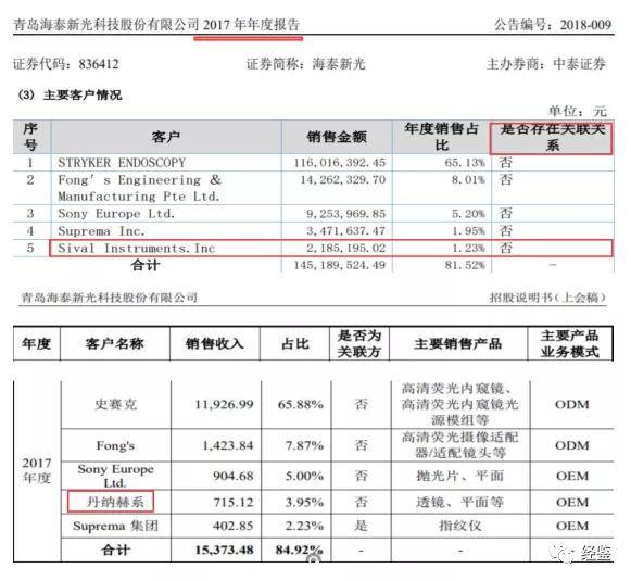 海泰新光新三板2017年报公示,SiVal Instruments, Inc.也是公司2017年大客户之一,且不存在关联关系;然而在海泰新光上会稿中,2017年SiVal Instruments, Inc.被丹纳赫系所顶替。