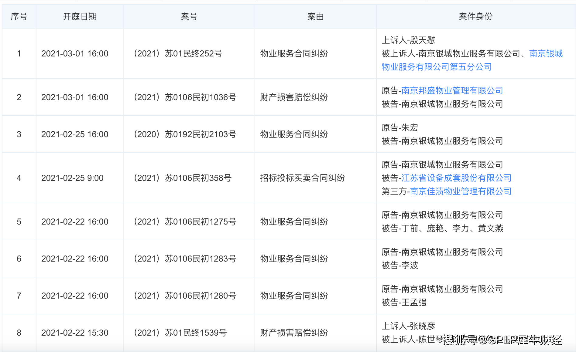 2月24日,GPLP犀牛财经了解到,南京银城物业服务有限公司(简称“银城物业”)新增多则开庭公告。2月22日到3月1日开庭的案件有8起,涉及物业服务合同纠纷、招标投标买卖合同纠纷和财产损害赔偿纠纷。