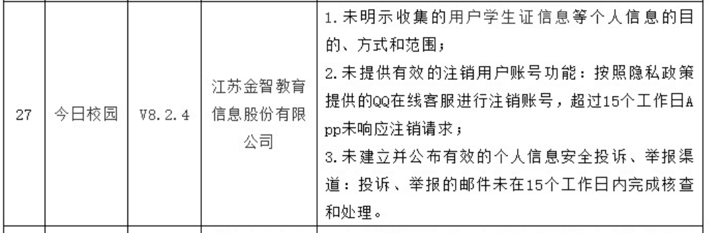 2020年11月17日,网信中国发布《关于35款APP存在个人信息收集使用问题的通告》,今日校园被列入其中。网信中国表示,今日校园有如下三点问题:1,未明示收集的用户学生证信息等个人信息的目的、方式和范围;2,未提供有效的注销用户账号功能:按照隐私政策提供的QQ在线客服进行注销账号,超过15个工作日APP未响应注销请求;3,未建立并公布有效的个人信息安全投诉、举报渠道:投诉、举报的邮件未在15个工作日内完成核查和处理。