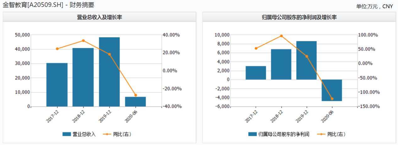 受疫情的影响,2020年上半年大多大学生并没有按时返校,均居家上网课。受此影响,金智教育的业绩也大幅缩水。2017-2020年上半年,金智教育的营业收入分别为3.02亿元、4.07亿元、4.82亿元和6865.72万元,营业收入同比增长率分别为24.64%、33.69%、18.50%和27.06%;同期归母净利润分别为3041.38万元、6794.58万元、8535.41万元和-4776.90万元,归母净利润同比增长率分别为53.44%、96.92%、25.62%和-122.15%。