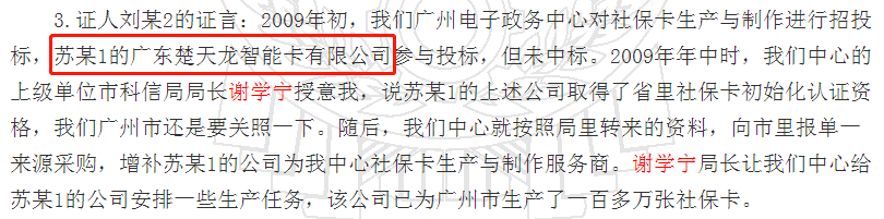 但是,楚天龙却罔顾了一个事实:在《谢学宁受贿一审刑事判决书》中,证人刘某2的证言显示:2009年初,我们广州电子政务中心对社保卡生产与制作进行招投标,苏某1的广东楚天龙智能卡有限公司参与投标,但未中标。